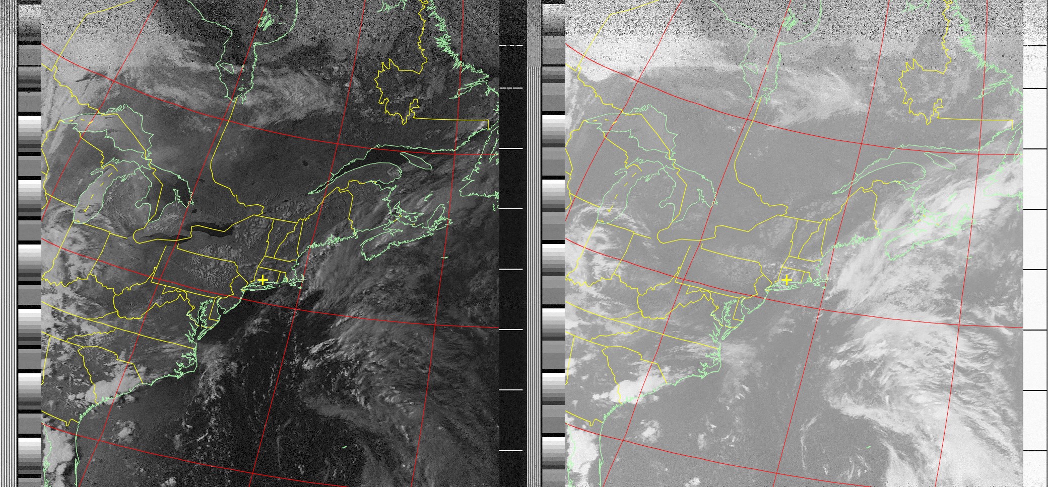 NOAA satellites broadcasting a right-hand circular polarized signal at 137MHz. I used an rtl-sdr